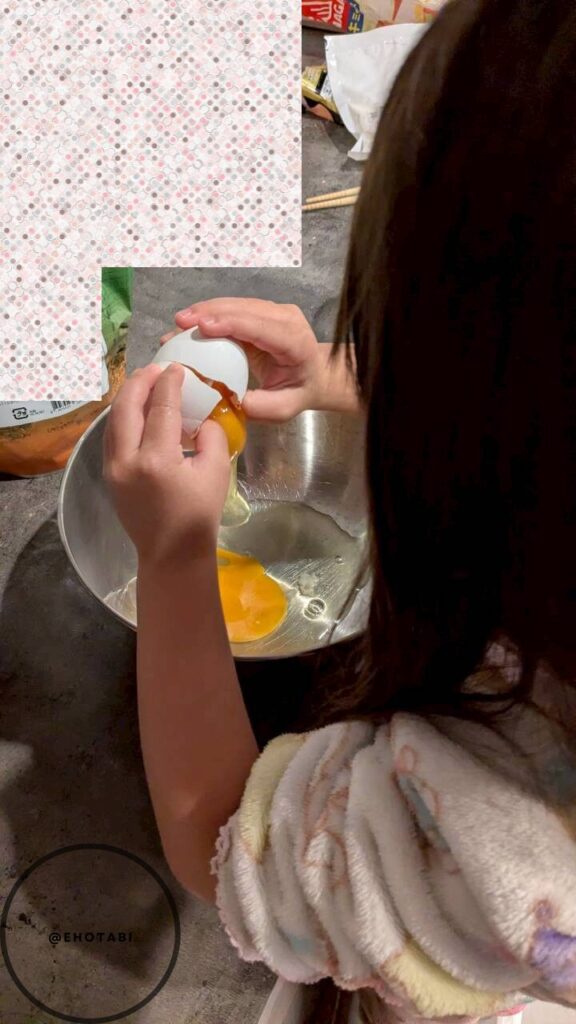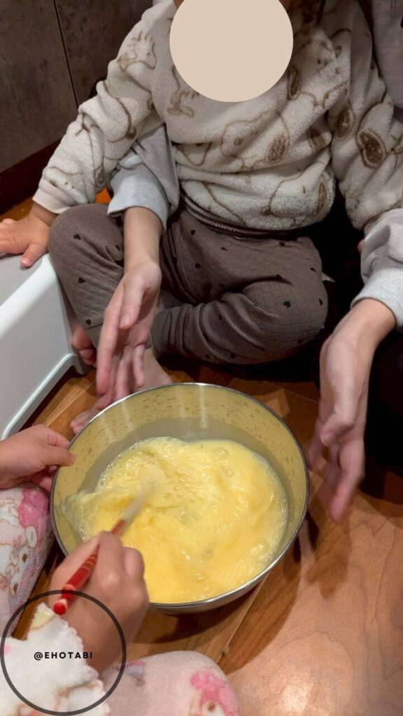 卵をわって〜お水をいれて〜よくかき混ぜるのね(牛乳は空っぽのため)