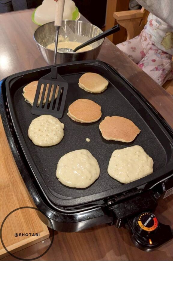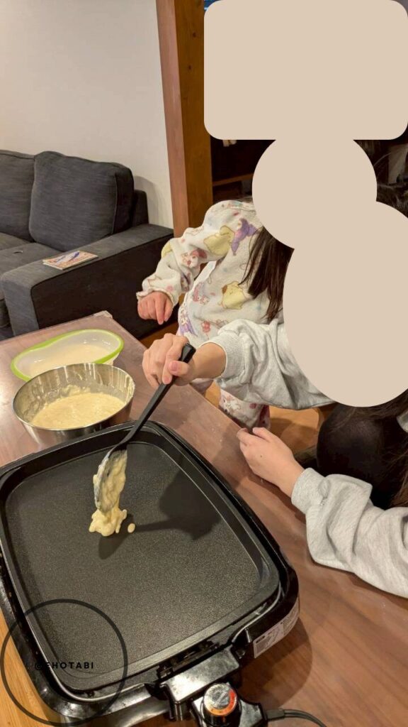 簡単だから子ども達にもお手伝いさせやすいです。テーブルの上にホットプレートを出せば、あったかホットケーキを好きなように食べられます。