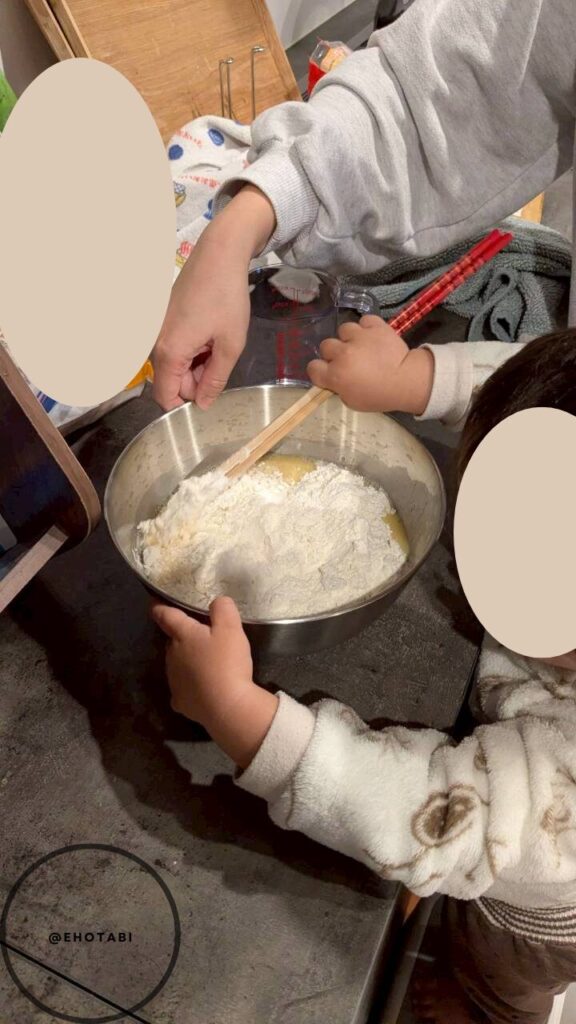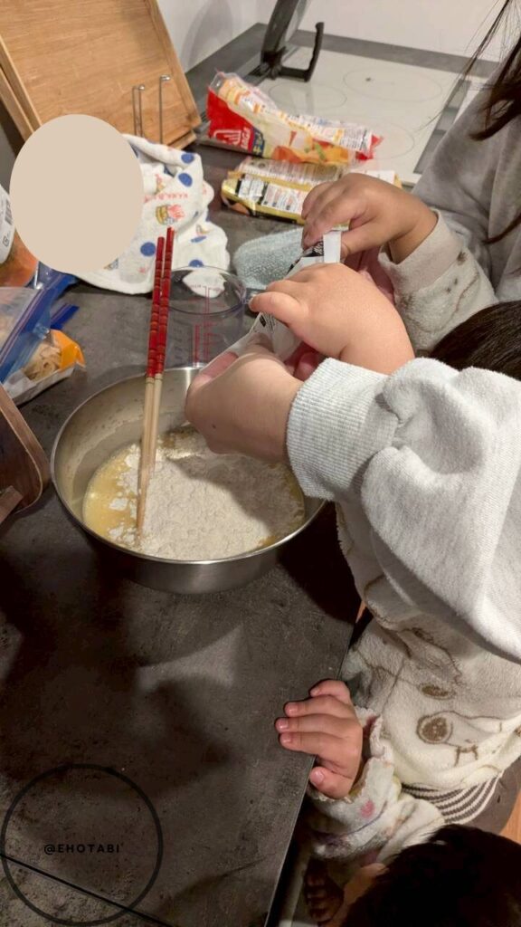 子ども達、靴はきも着替えも人にやらせるのに、ホットケーキ作りだけはやりたがる。