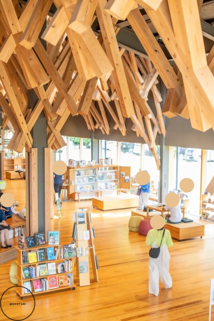 広い空間に木材をふんだんに使用し、美しい木組みと明るい陽射しの調和で異世界に来たような感じです。