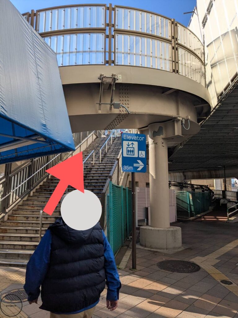 横断歩道は渡らないで、左に曲がります。高架下をくぐると、ななめ右前方向に歩道橋が見えてきます。