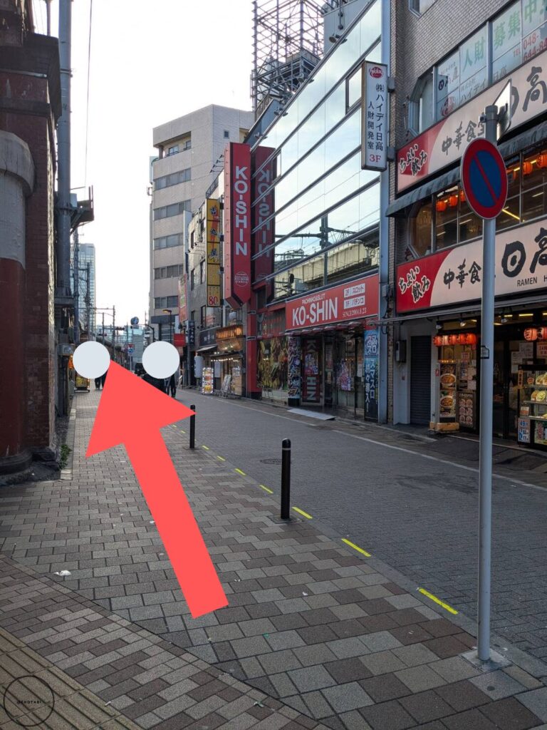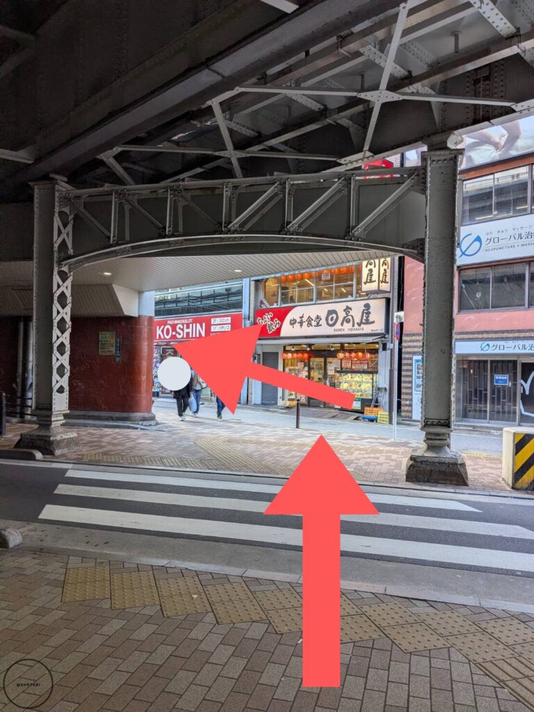 出るとすぐ横断歩道があるので渡って、高架脇の居酒屋さんなどが立ち並ぶ道を歩きます。