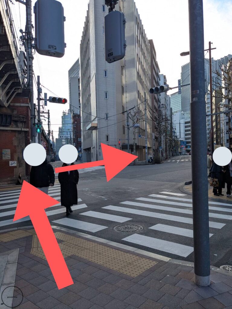 交差点を渡って、右へ。東京駅方面へ向かいます。
