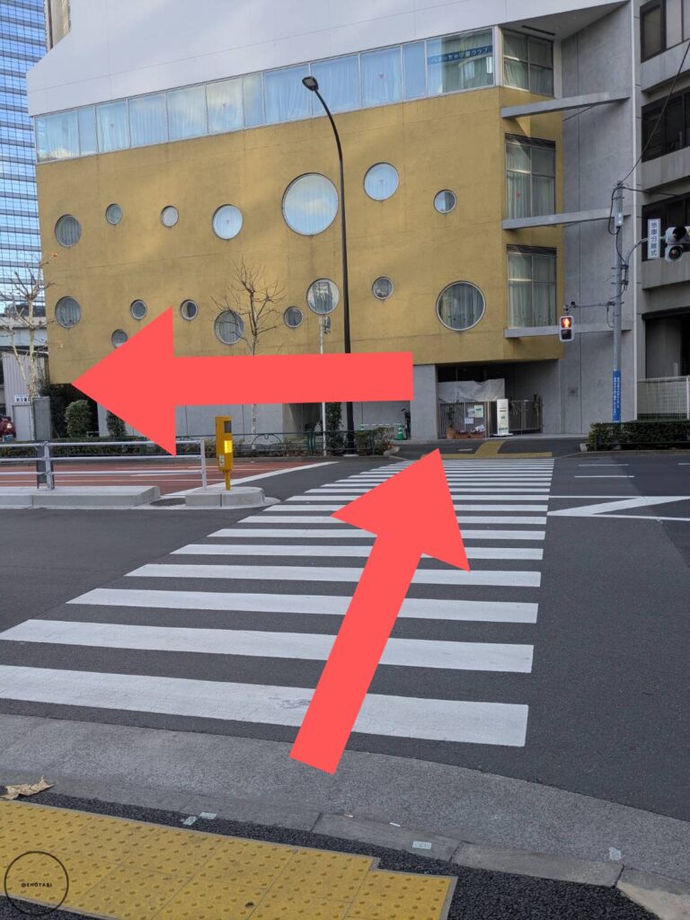 黄色い建物の方に横断歩道を渡って、左へ。もうすぐです。