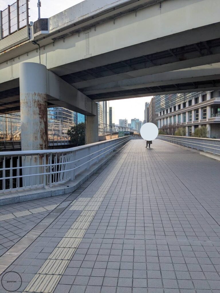 横断歩道は渡らないで、左に曲がります。高架下をくぐると、ななめ右前方向に歩道橋が見えてきます。